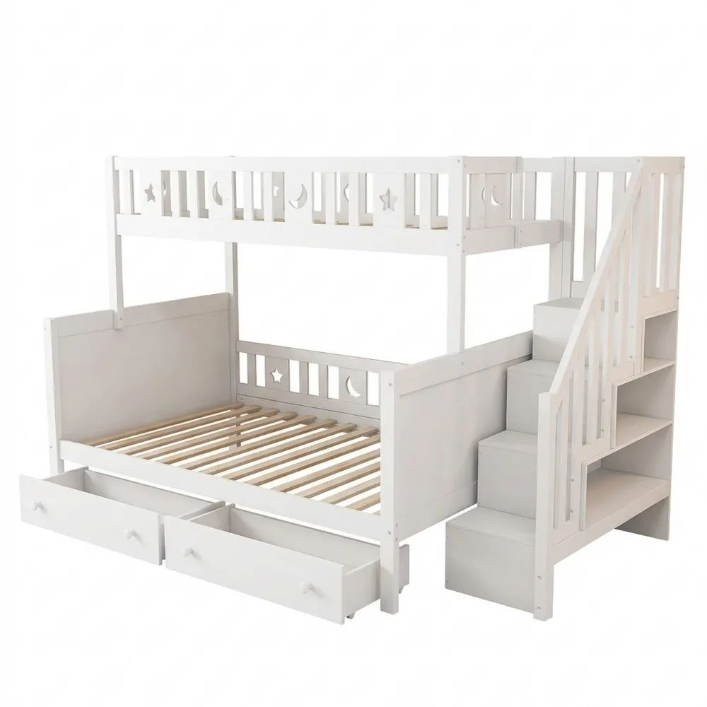 Multifunktionales Design: Dieses Etagenbett bietet oben eine Liegefläche von 90 x 200 cm und unten eine von 140 x 200 cm. Es ist mit Stern- und Mondmotiven gestaltet, die besonders in einem Kinderzimmer ansprechend sind. Sicherheitsleiter mit Stauraum: Die Leiter enthält integrierten Stauraum und erleichtert den Zugang. Sicherheit: Das obere Bett ist mit einem 29 Zentimeter hohen Geländer ausgestattet. Beide Betten verfügen über Lattenroste. Zusätzlicher Stauraum: Unter dem Bett befinden sich zwei Schubladen, die flexibel bewegt werden können.