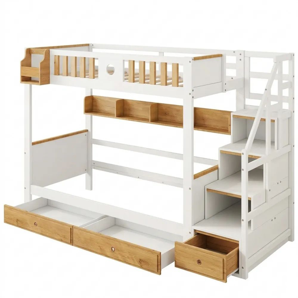 Das Etagenbett verfügt über eine integrierte Stauraumtreppe mit vier Schränken zur Aufbewahrung von Kleidung und Spielzeug. Es gibt Regalböden und einen Regalkasten für Bücher und Dekorationen, sowie zwei Schubladen unter dem unteren Bett. Der Rahmen besteht aus Kiefernholz und MDF für Stabilität. Eine runde Tafel am oberen Bett ermöglicht das Schreiben mit Kreide.