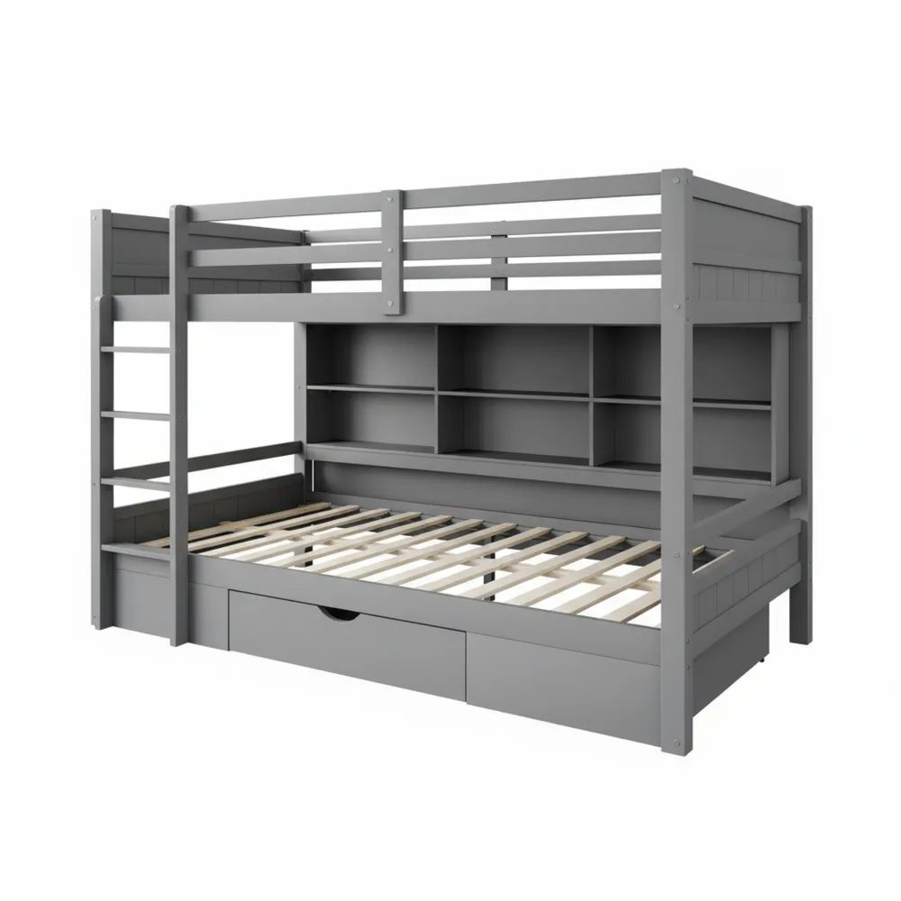 Das minimalistische Design des Bettes passt zu verschiedenen Einrichtungsstilen. Es eignet sich gut für Familien mit zwei Kindern oder für Gäste. An der Bettseite befinden sich Ablagefächer, und unten befindet sich eine Schublade zur Aufbewahrung von Kleidung und anderen Gegenständen.