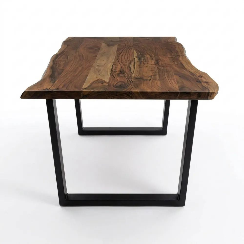 Holztisch mit charakteristischer Baumkante und Metallbeinen in Schwarz. Hergestellt aus Akazienholz mit nussbaumfarbener Maserung. Leicht zu pflegen, Verschmutzungen können mit einem feuchten Tuch gereinigt werden. Der Tisch aus massivem Holz verleiht jedem Raum ein warmes Ambiente und lässt sich gut mit verschiedenen Möbelstilen kombinieren. Das Akazienholz wird aus nachhaltigem Anbau bezogen und mindestens 12 Monate gelagert und getrocknet. Die Tischplatte entsteht durch das Verleimen der Bohlen, gefolgt von einer Behandlung mit Harz zum Verschließen von Astlöchern. Zum Abschluss wird die Oberfläche lackiert.