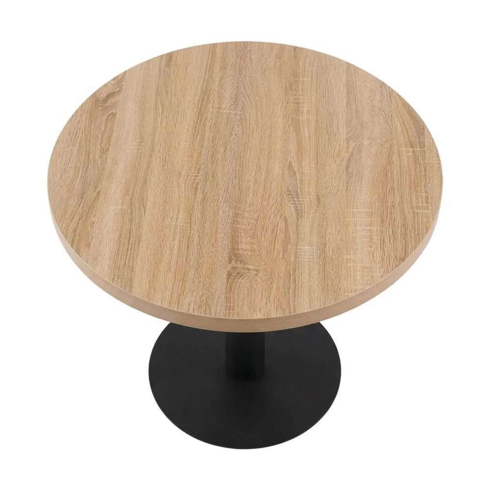 Runder Esstisch mit den Maßen 80x80x75cm, geeignet für 4 Personen. Die Tischplatte hat eine Eichenholzmaserung und zylindrische Eisenbeine bieten eine stabile Unterstützung. Der Tisch kann als Esstisch, Balkontisch, Küchentisch, Wohnzimmertisch und Frühstückstisch verwendet werden. Rutschfeste Füße schützen den Boden. Einfache Konstruktion mit klar gekennzeichneten Teilen erleichtert die Montage.